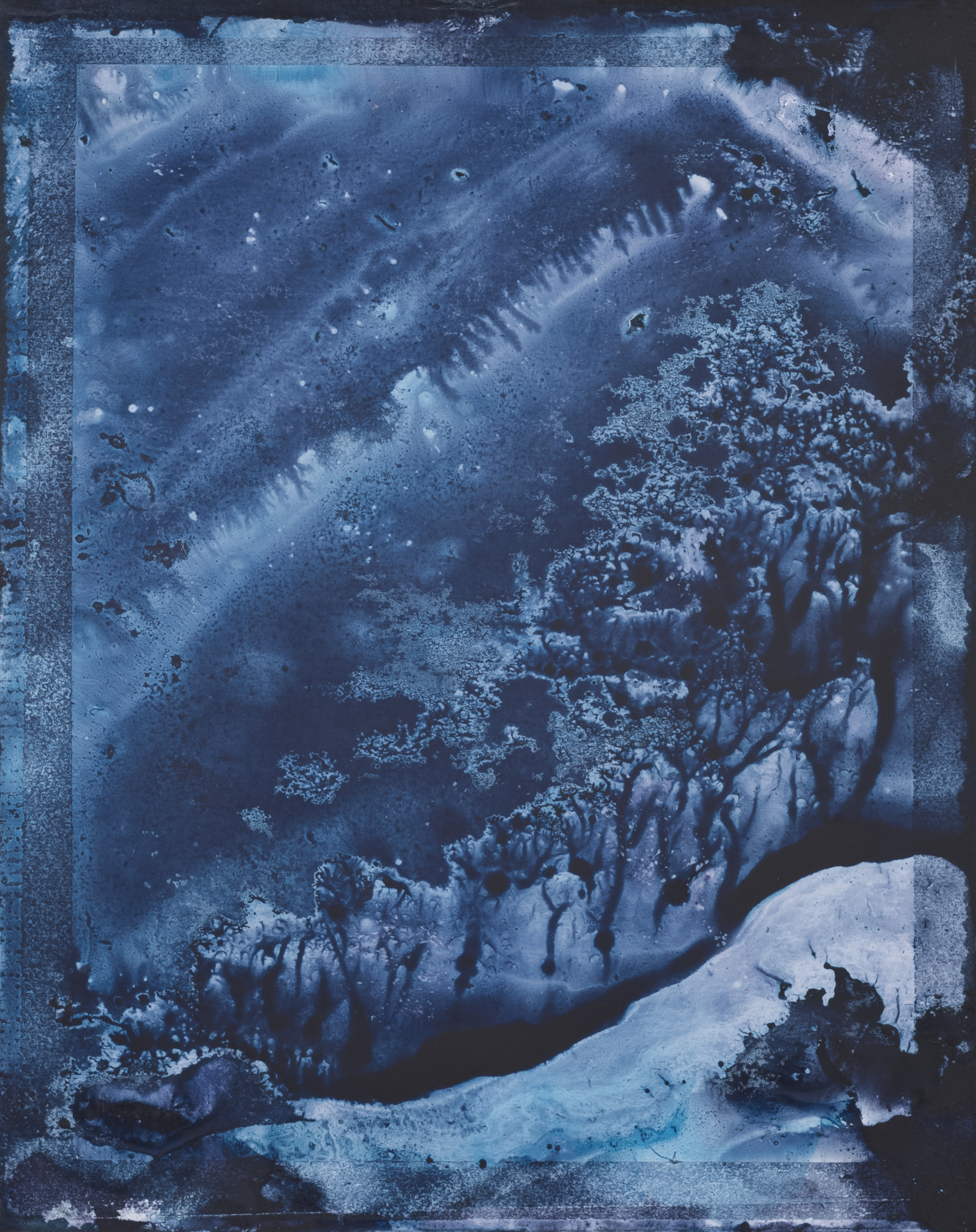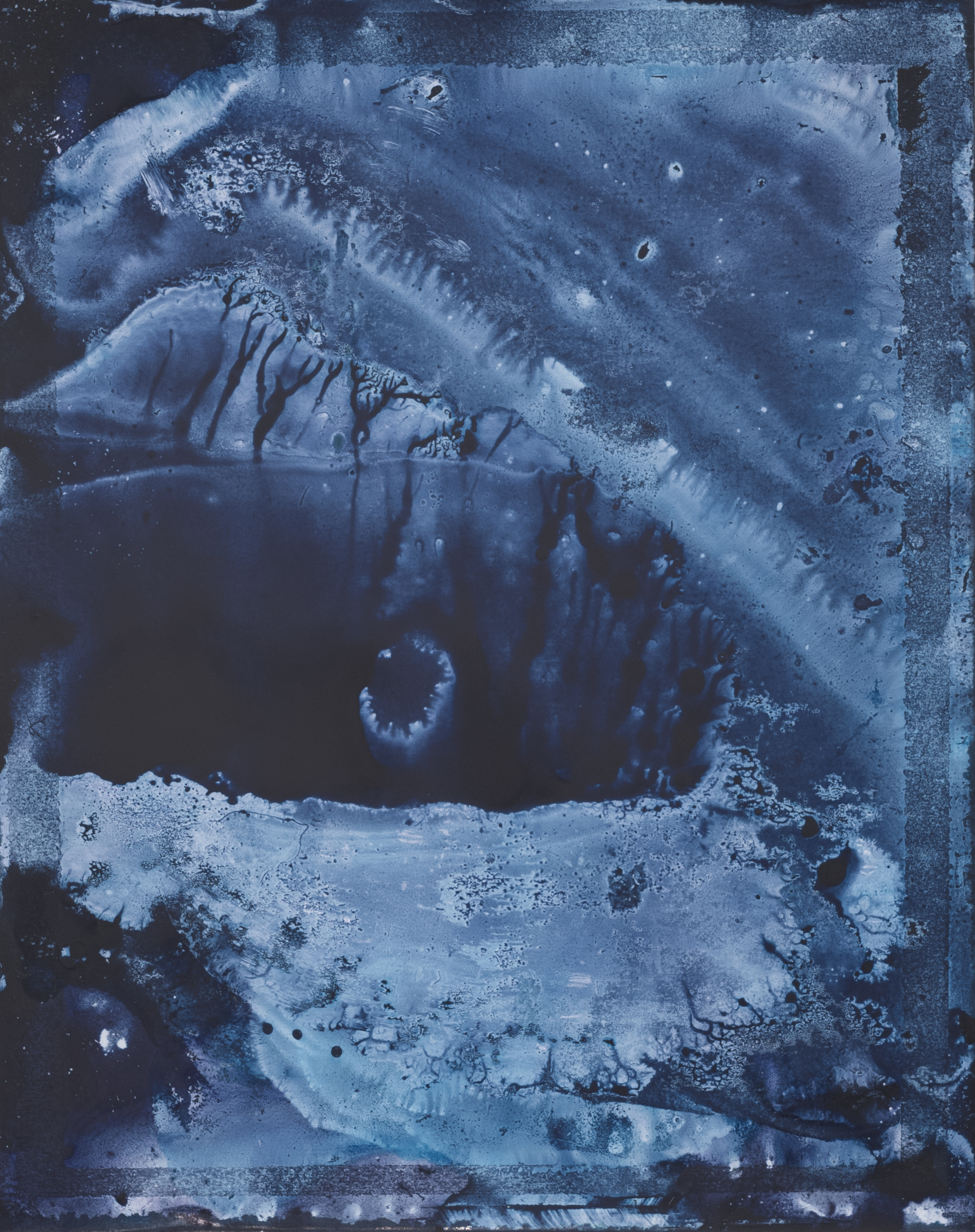 Hier ist eine Cyanotypie, auch Blaupause genannt zu sehen. Es ist eine experimentelle Arbeit, die mit der entsprechenden Chemie auf altem Fotopapier hergestellt wurde. In diesem Fall ist es ein Polaroid Pack Film aus dem Jahr 1975. Der Packfilm war teilweise nicht mehr zu verwenden, um ihn nicht zu entsorgen, wurde er als Grundlage für eine experimentelle Arbeit genutzt.
