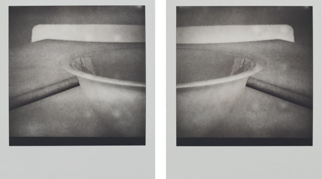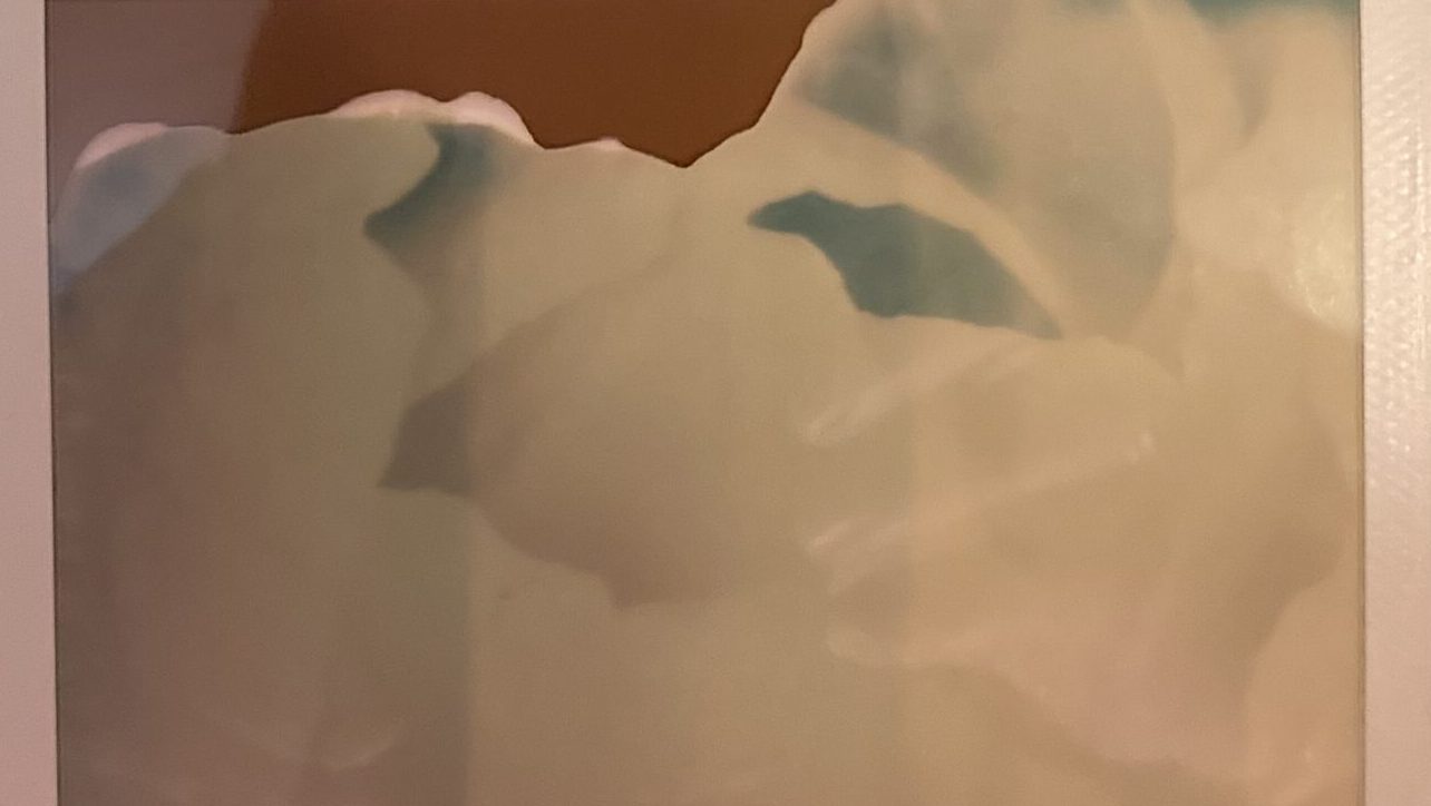 Hier ist eine Cyanotypie, auch Blaupause genannt zu sehen. Es ist eine experimentelle Arbeit, die mit der entsprechenden Chemie auf altem Fotopapier hergestellt wurde. In diesem Fall ist es ein Polaroid Pack Film aus dem Jahr 1975. Der Packfilm war teilweise nicht mehr zu verwenden, um ihn nicht zu entsorgen, wurde er als Grundlage für eine experimentelle Arbeit genutzt.